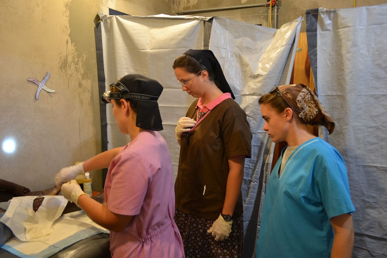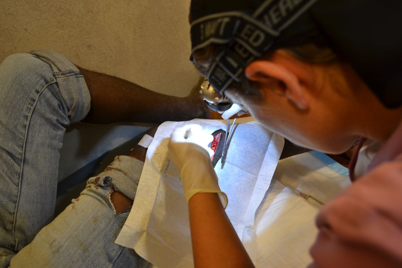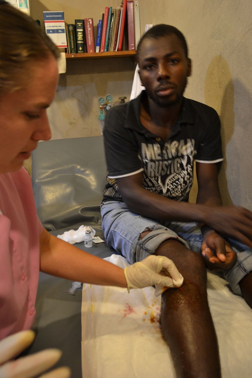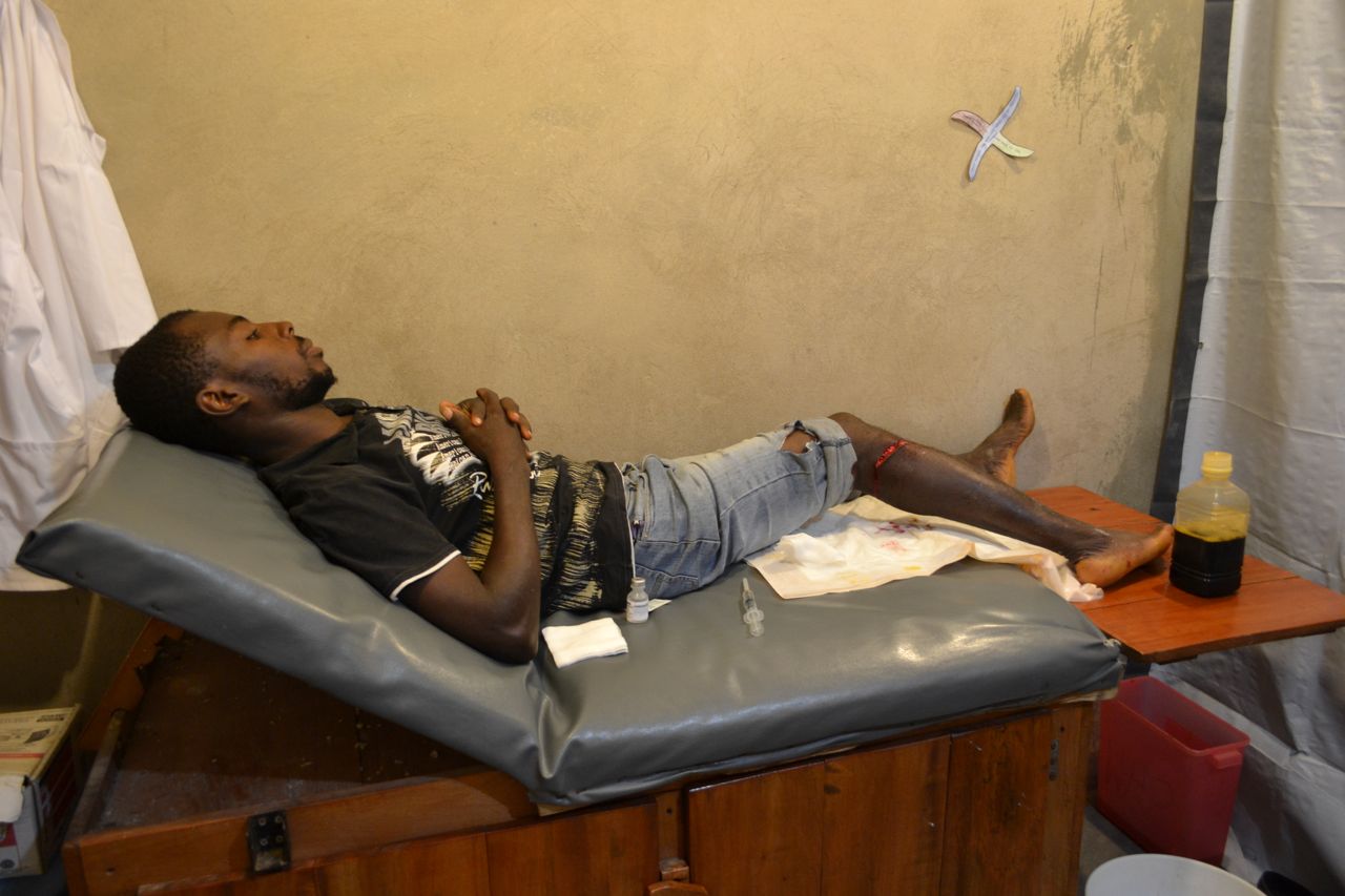By the time I came into the clinic with the camera they had already propped him up and were beginning to clean the wound.