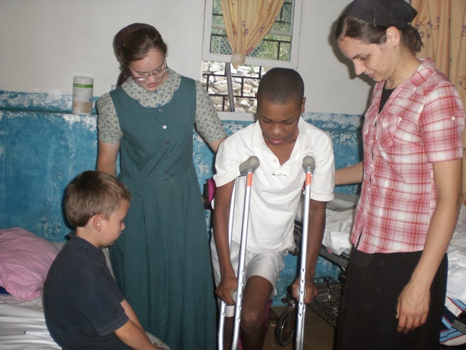 “In the Name of Jesus,” Jean Franz chanted as he waved his leg and did his physical therapy exercises. It was so good to see him bouncing around and in good spirits. No tears today! His leg is continually making new skin, and he seems to be fighting infection quite bravely, although we know that the possibility of infection beginning is just around the corner at any time. “In the Name of Jesus”, healing can happen, though. That part is thrilling. Later today we pulled out some crutches to help him stomp his happy foot a bit more, and get some outside fresh air more often.