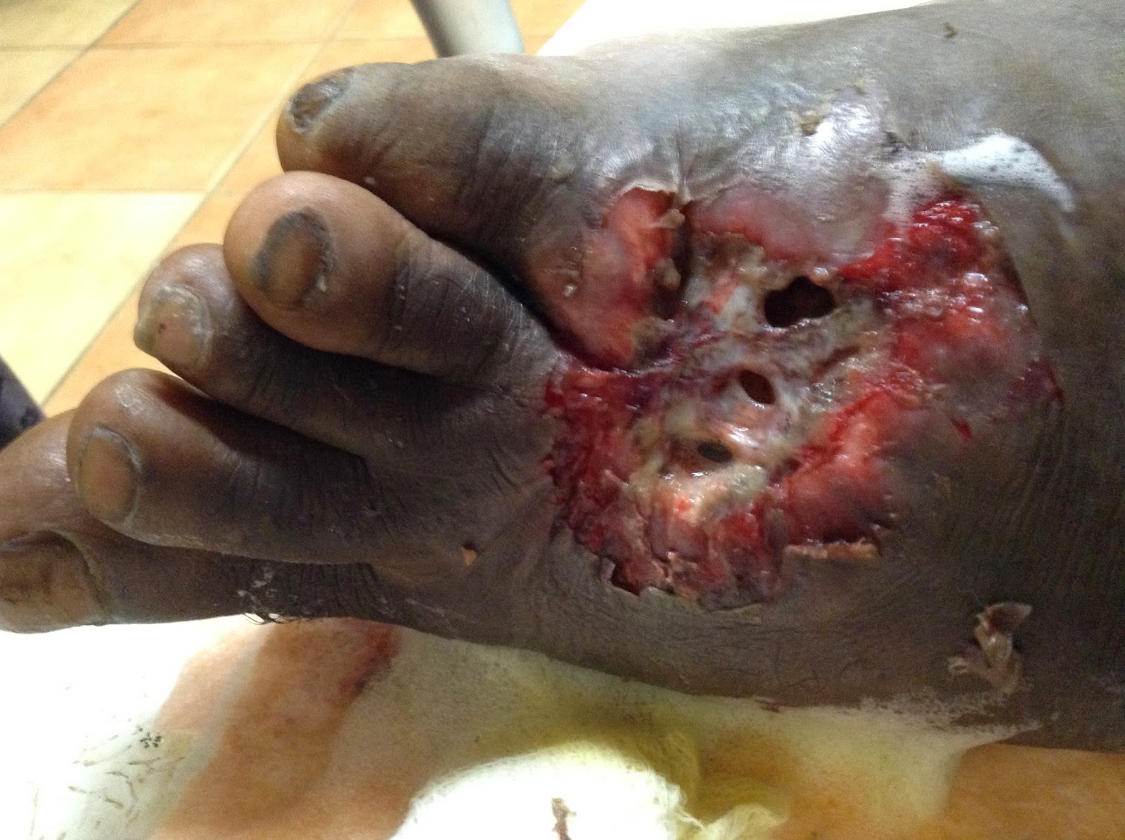 Here is a picture of one more “foot problem” He smashed his foot really bad 2 years ago and went to Tit Guave to get it fixed, he tells me wincing while I apply pressure to release the pus. Right now it looks slightly different, the top is open and there is a 3/4 in. deep and 3 in. long hole. Thanks to Whit’s Epsom salt I don’t have to plug my nose anymore while cleaning it out. 🙂