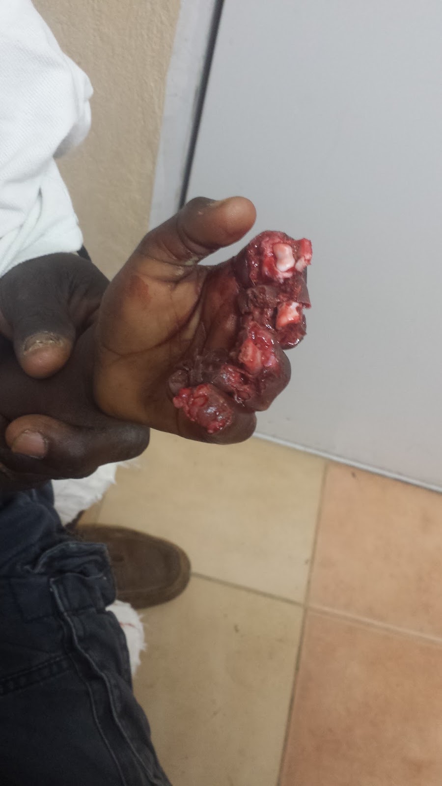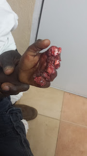 Living in a land of mountains…is beautiful but dangerous…this brave little tyke went to tie his goat to a patch of grass. A rock came tumbling down the mountain and pinned his little hand.